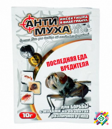 **Діючі речовини:** метоміл, трансфлутрин. **Препаративна форма:** гранули. **Застосування:** Для знищення дорослих мух розкладають гранули на підкладки (кришки) у кількості 2,5 г/1 м². Для обробки 4 м² достатньо одного пакета вагою 10 г. Приманкові станції розміщують у місцях найбільшої кіль...