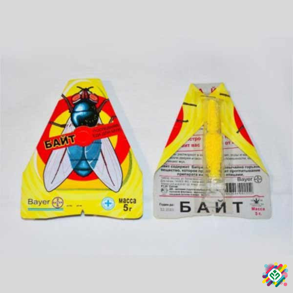 Гранульований продукт для боротьби з мухами, який містить феромон, що змушує мух легко поїдати приманку, що дозволяє ефективно боротися з цими шкідниками. "Байт муха" (гранула) містить бітрекс - дуже гіркий компонент, який запобігає ковтанню приманки тваринами та птахами, зробляючи "Байт муха" (гран...