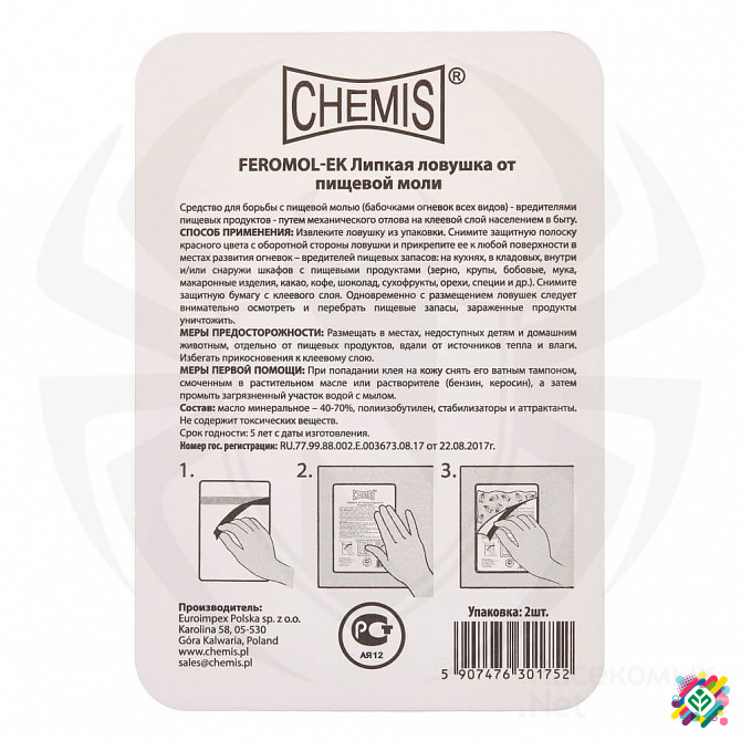 Інсектицидний засіб Chemis Feromol-EK - липка пастка від молі, призначена для боротьби з метеликами-огнівками, шкідниками продовольчих запасів шляхом механічного улову на клейовий шар. Застосовується на об'єктах різної категорії, а також в побуті. Пастка є виробом з паперовою основою, покритою неток...
