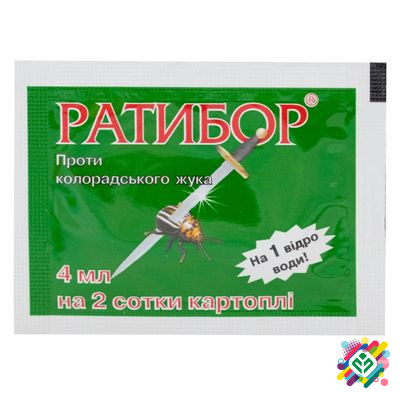 **Препарат Ратибор 4 мл** **Діюча речовина:** імідаклоприд, 200 г / л **Ратибор 4 мл** - це високоефективний та швидкодіючий інсектицид, призначений для захисту картоплі, помідорів і баклажанів від колорадського жука, а також яблунь, слив, цибулі та цукрової свекли від широкого комплексу шкідників...