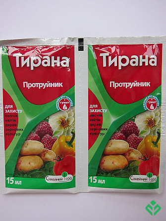 Упаковка доступна у розмірах: 15 мл, 50 мл, 250 мл, 1 л. Препарат "Тирана" є протравительним засобом комплексної дії, який надійно захищає посадки картоплі та овочевих культур, дерев, кущів та квітів від листоїдів, сисаючих та ґрунтових шкідників протягом вегетаційного періоду рослин. Він знищує ко...