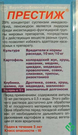 Престиж 10 мл - призначений для захисту шляхом проплавлення клубнів картоплі перед посадкою, замочування кореневої системи овочевих культур: баклажана, перцю, томата, капусти. Ефективно захищає плодові, декоративні та лісові культури. Препарат знищує та запобігає поширенню шкідників: колорадського...