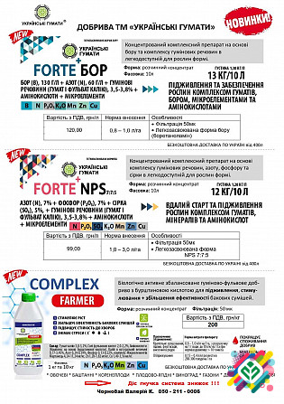 **Добриво "Українські гумати" PROFESSIONAL для Сільськогосподарських Культур** **Норма використання:** 0,15-0,2 літра на гектар. **Упаковки:** - 1 літр за 300 грн (достатньо для 5 гектарів) - 5 літрів за 1200 грн (достатньо для 25 гектарів) - 10 літрів за 2200 грн (достатньо для 50 гектарів) **Ос...