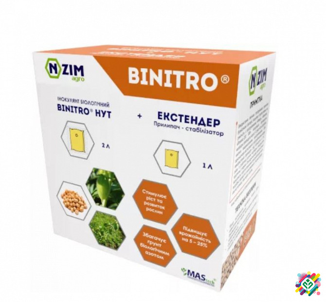 Інокулянт для нуту BiNitro Нут Інокулянт для нуту "BiNitro Нут" - це двокомпонентний рідкий препарат (інокулянт + екстендер) для передпосівної інокуляції насіння нуту на основі культури бульбочкових бактерій Mesorhizobium ciceri штаму MC 285 з титром не менше 2х10^9 КУО/мл та продуктів (фітогормони...