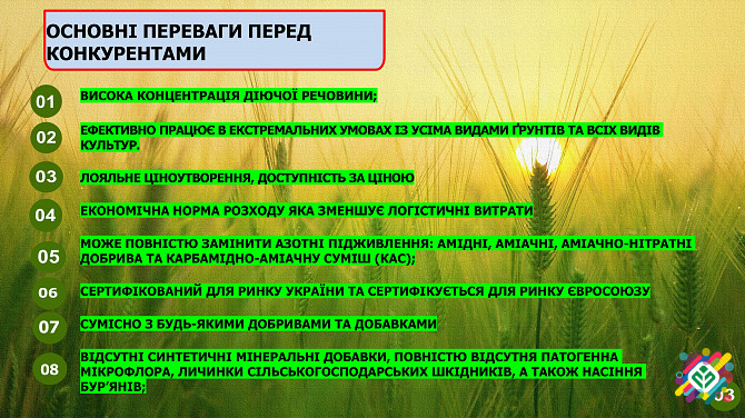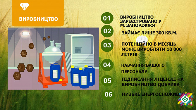 Ідея бізнесу полягає у виробництві органічних добрив, які відсутні від хімічних компонентів, а також корисних копалин (таких як торф) та антибіотиків. Це комплексне та концентроване добриво, що володіє технологією, захищеною патентом на корисну модель №151164 від 15 квітня 2022 року. Добриво є сумі...