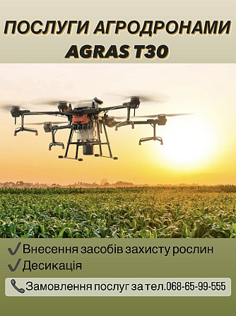 Виконуємо послуги по внесенню ЗЗР, десикація агродронами. Ціна договірна, залежить від кількості і складності полів. Надаємо послуги з 2021 року, фахівці нашої фірми мають величезний досвід у галузі агрономії. Працюємо по всій Україні. Агродрон Agras T30 має наступні характеристики: - Виробіток 1...