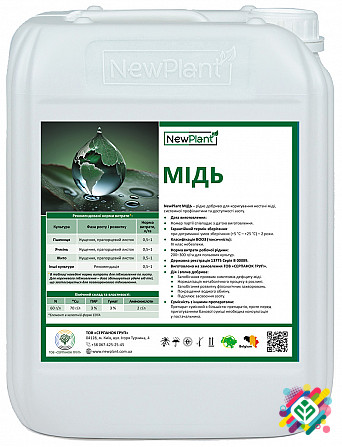 NewPlant Cu-70 IQ* - Рідке добриво, призначене для коригування нестачі міді, системної профілактики та підвищення доступності азоту для рослин. Склад: - Азот (N) - 60 г/л - Мідь (Cu) - 70 г/л - Гумат - 3% - ПАР (поліамінопропілфосфінокислота) - 3% - Амінокислоти - 2 г/л NewPlant Cu-70 IQ* містить ...